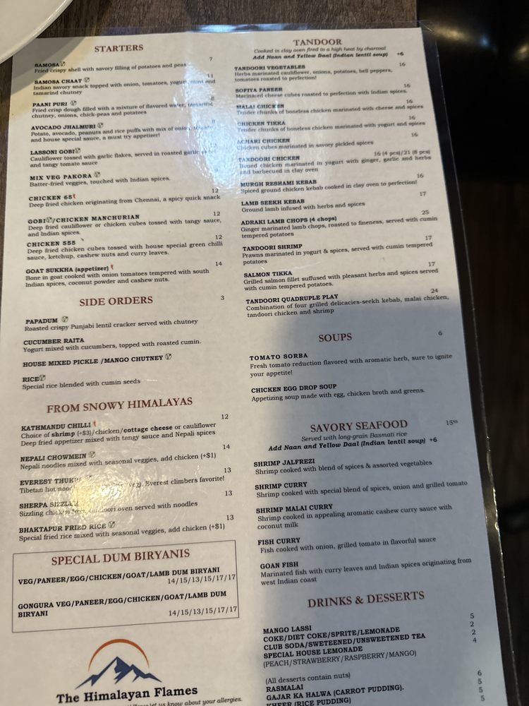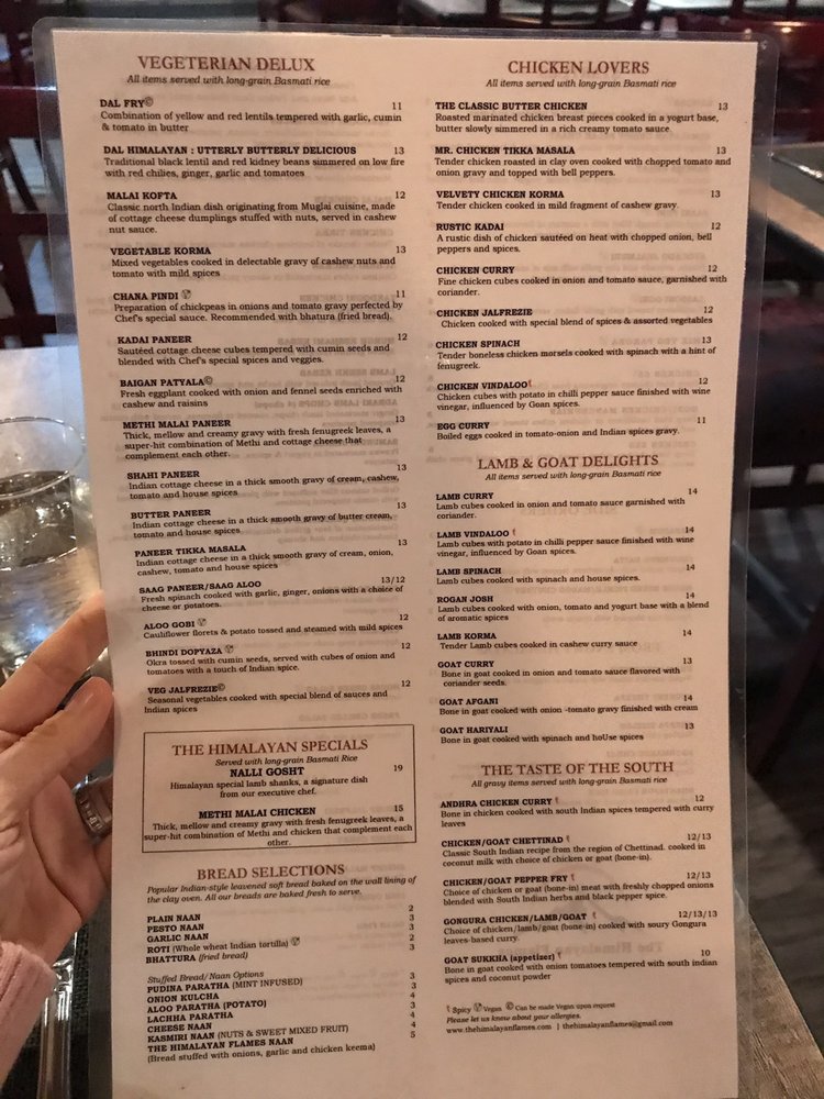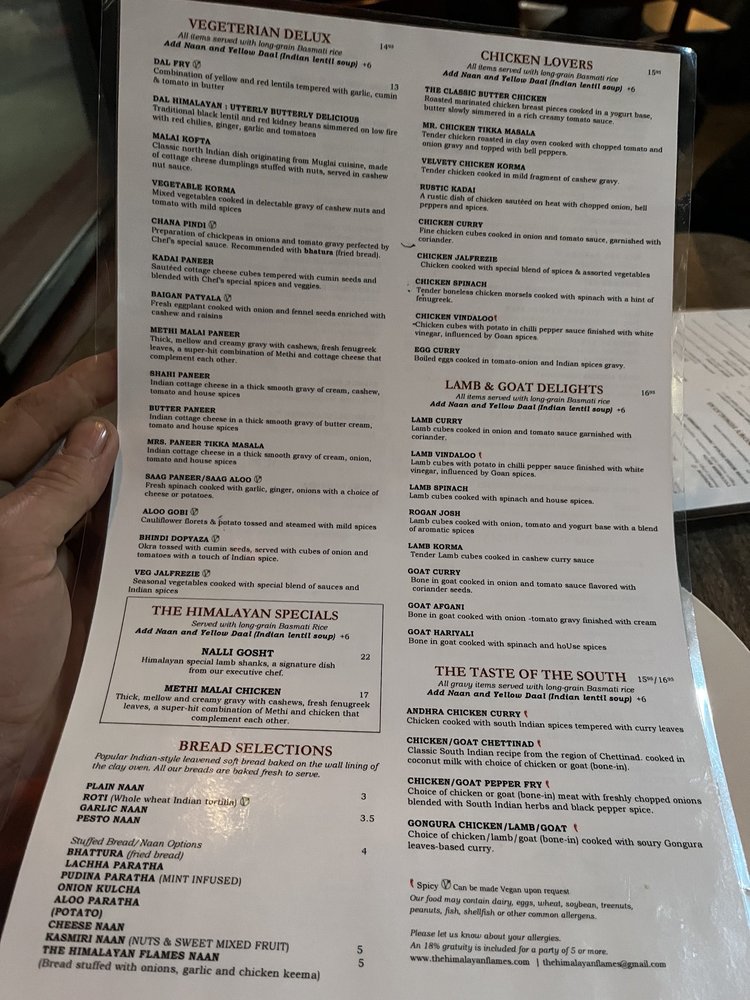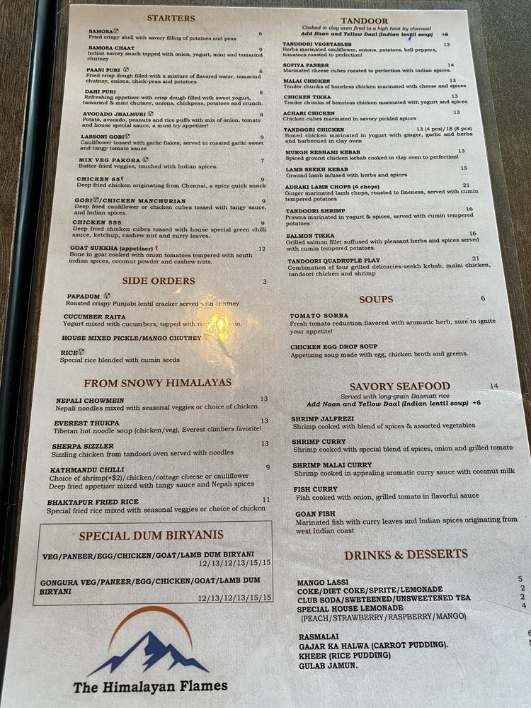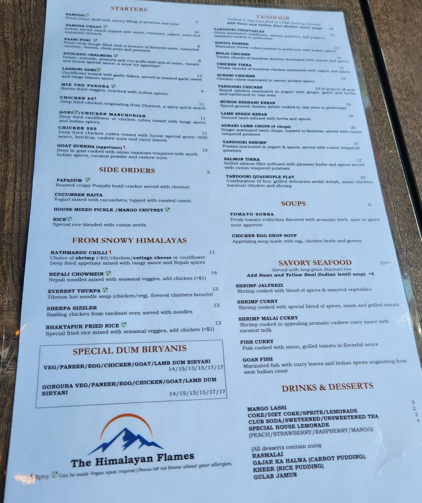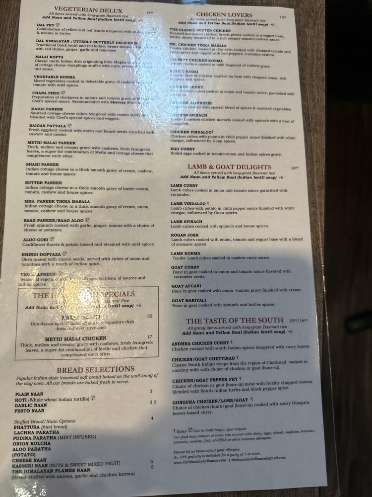 Introducing the menu at The Himalayan Flames, located in Dearborn, MI, where customers rave about the flavorful and authentic Himalayan cuisine. With options like Avocado Jhalmuri, Nalli Gosht, Methi Malai Chicken, Yellow Daal, and a unique Himalayan Flames Naan, there's something for everyone to enjoy. Reviewers praise the perfectly cooked lamb shank, creamy lentil soup, warm naan, and delicious mango lassi. The attentive service and welcoming ambiance add to the overall dining experience. Whether you're a fan of rich flavors, unique textures, or simply looking for top-notch Indian food in Michigan, The Himalayan Flames is a must-visit destination. Don't miss out on this gem offering vegan and vegetarian options, catering services, and a classy dining experience.